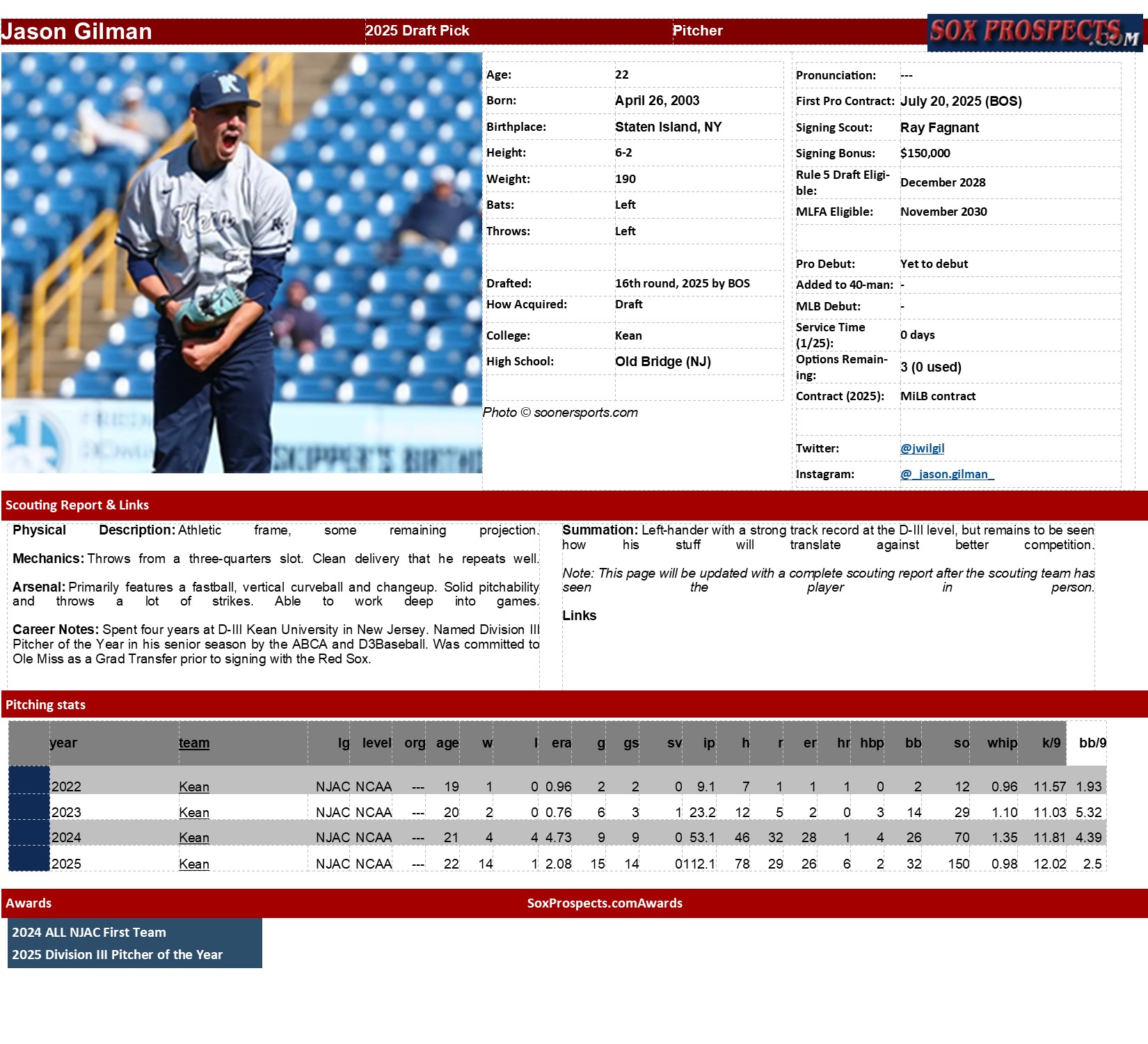 An Old Bridge alum, Gilman was a First Team All-Conference selection in the NJAC this year out of Kean. He is the first Division 3 player drafted from New Jersey this season after popping off for 150 strikeouts in 112 1/3 innings with a 2.08 ERA.
